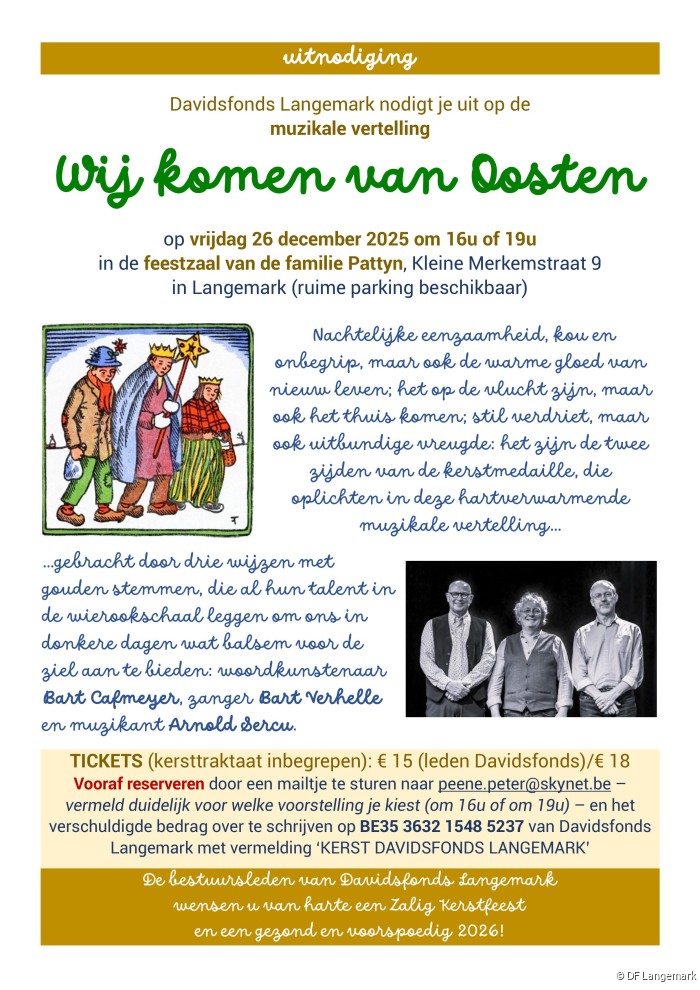 26 dec # 11499 WIJ KOMEN VAN OOSTEN Hartverwarmend kerstprogramma met Bart Cafmeyer, Bart Verhelle en Arnold Sercu. vrijdag 26 december 2025 van 16:00 uur tot 21:30 uur Over Sprekers Aanmelden Labels: Mens & MaatschappijOntspanning & OntmoetenZingevingVoorstelling (theater, literatuur, film,...)Cultuurregio WesthoekAanstekelijkBegeesterendUitbundig